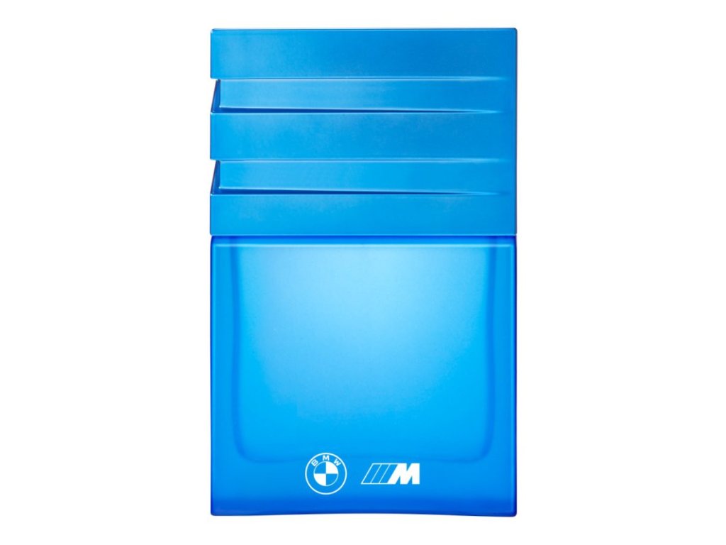 - Flakon v zářivě světle modré barvě reprezentuje první pruh loga M.